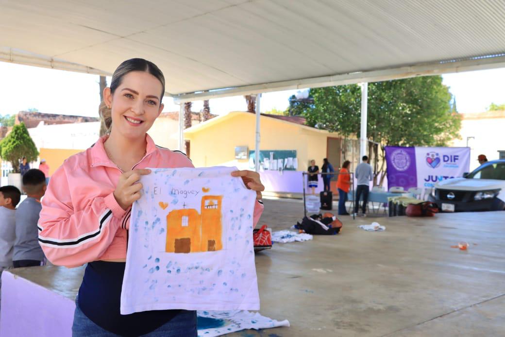 Fue en la comunidad El Maguey donde la presidenta honorífica Karla Estrada visitó a las y los niños de la escuela primaria Independencia, ubicada en esta comunidad.