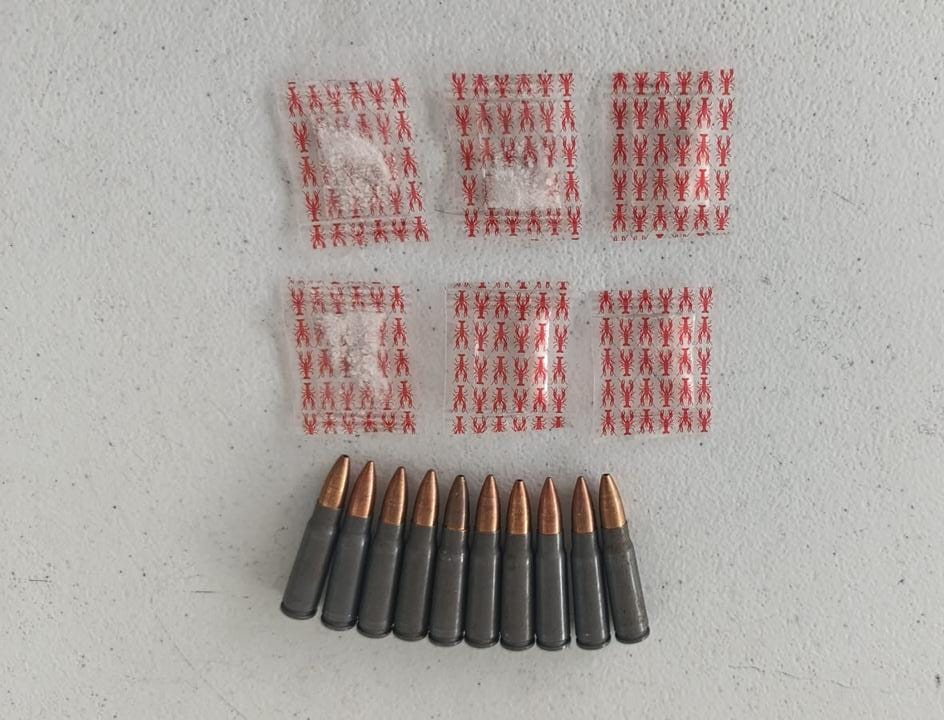 Al realizarles una revisión, se les encontró lo siguiente: Tres envoltorios de plástico transparente con una sustancia granulada, presumiblemente la droga conocida como “cristal”; Diez cartuchos útiles de arma de fuego calibre 7.62×39 mm.