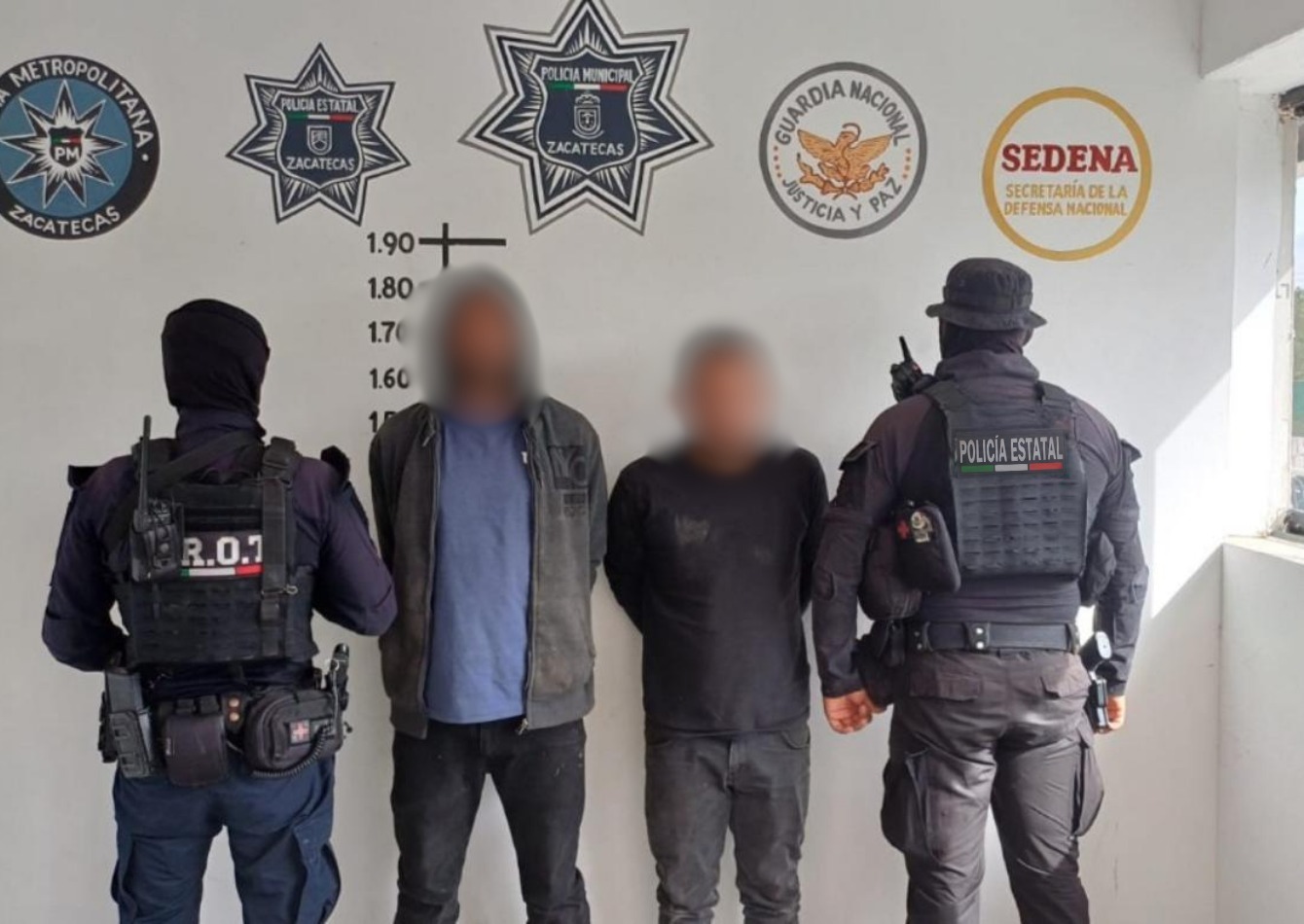 Zacatecas, Zac.- Elementos de la Policía Municipal de Zacatecas, en coordinación con la Policía Estatal Preventiva, detuvieron a dos hombres de 29 y 35 años en la colonia Estrella de Oro, por su presunta participación en delitos como cohecho, amenazas, portación de cartuchos de uso exclusivo del Ejército, Armada y Fuerza Aérea, robo equiparado de vehículo, narcomenudeo, así como desobediencia y resistencia de particulares.