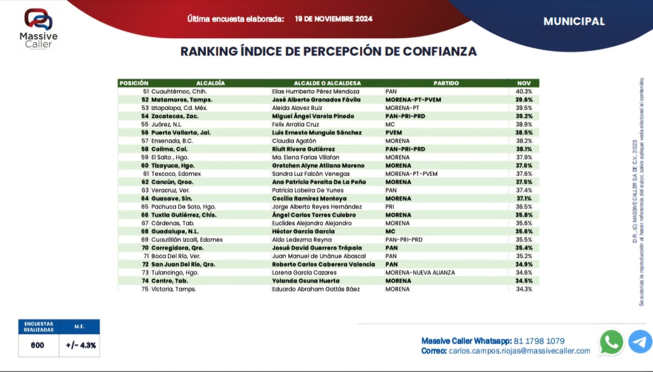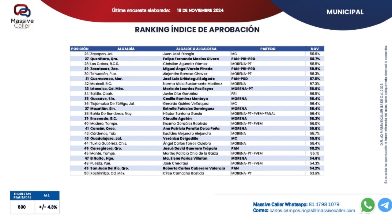 Zacatecas, Zac.- La empresa encuestadora Massive Caller dio a conocer los resultados de la encuesta telefónica del Ranking de Alcaldes por municipio situando a Miguel Varela Pinedo en el lugar #29 con mejor índice de aprobación. La encuesta se realizó en 2 mil 458 municipios de todo el territorio mexicano.