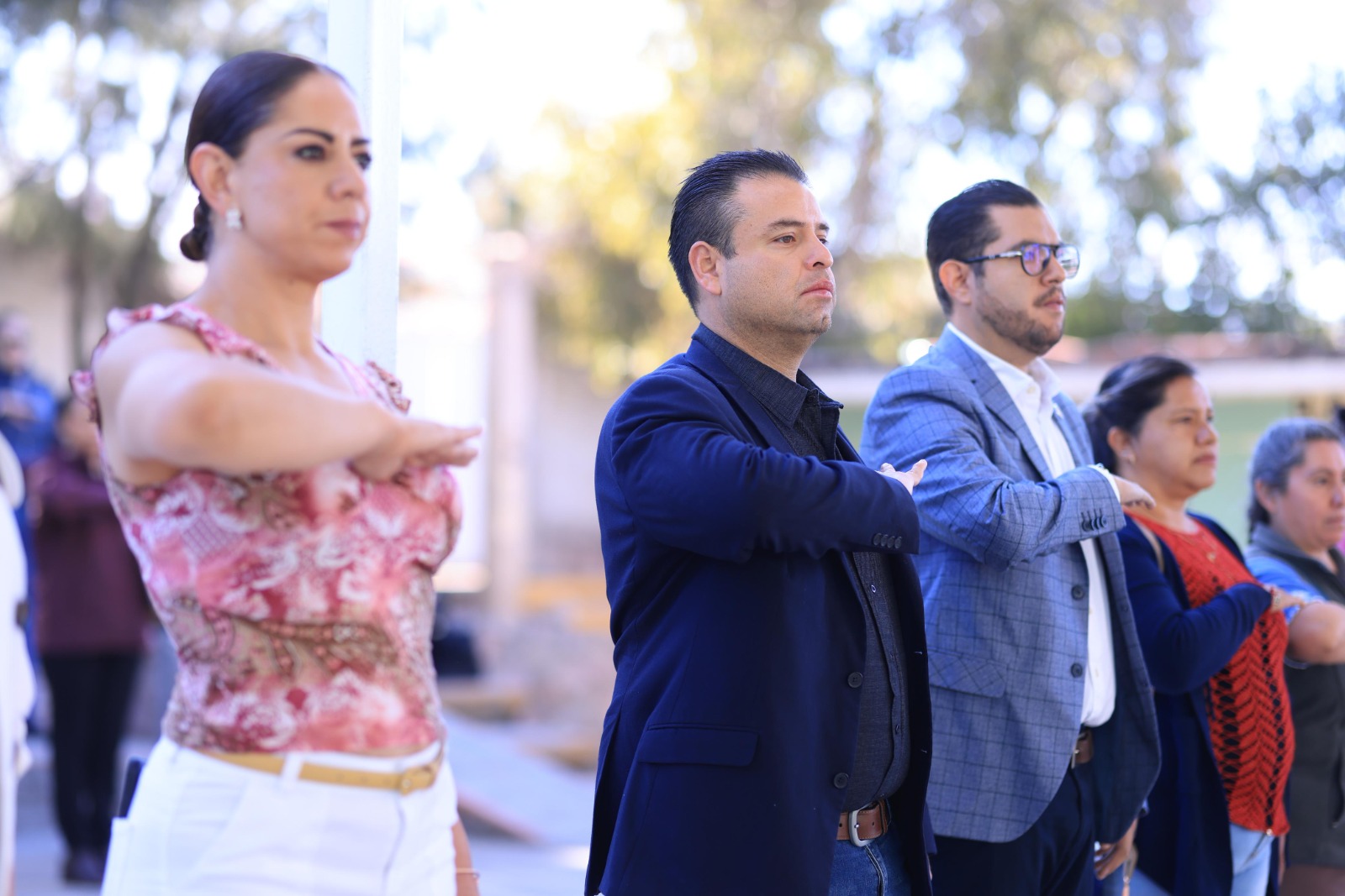 Zacatecas, Zac.- El alcalde de Zacatecas, Miguel Varela Pinedo, asistió esta mañana a la ceremonia de Honores a la Bandera en la Escuela Primaria Flores Magón, donde compartió con la comunidad estudiantil, maestros y padres de familia. Durante el acto cívico, los presentes reafirmaron su compromiso con los valores patrios y el fomento a la educación.