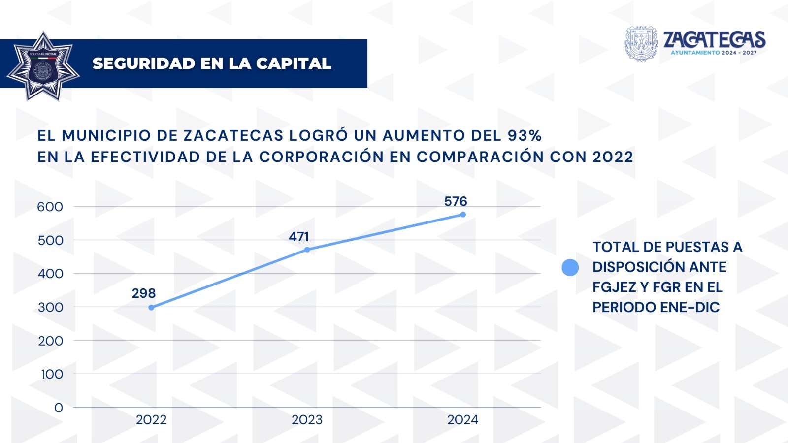 Además, durante 2024, se realizaron 576 puestas a disposición ante la Fiscalía General de Justicia del Estado (FGJEZ) y la Fiscalía General de la República (FGR), lo que representa un aumento del 93 por ciento en la efectividad respecto a hace dos años. Los principales delitos por los que se registraron estas detenciones fueron violencia familiar, narcomenudeo y robo a comercio.